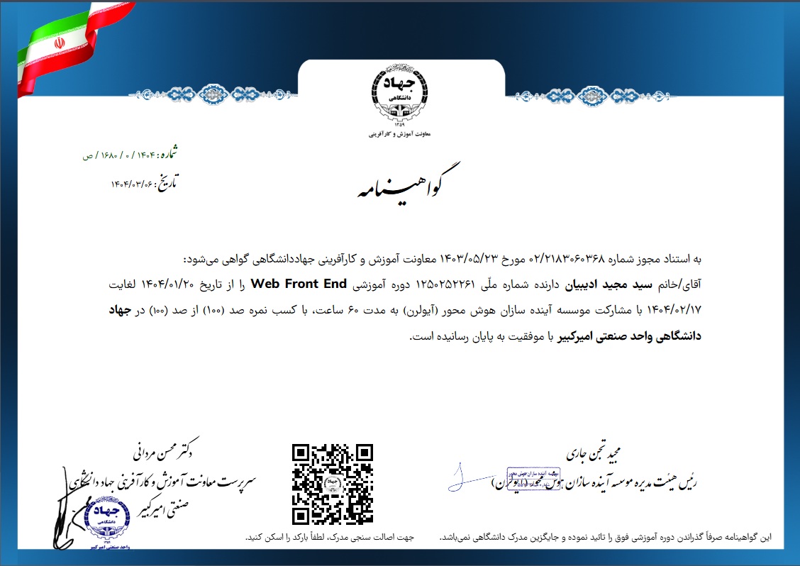 " مـن و تیم کوچک و دوستداشتنـیام ایـنجا در تلاشه تا بهـترین تجربههای برنـامهنویـسی رو برای شما خلـق کنه. من با حدود پنـج سـال سابقـه در دنیـای برنامهنویـسی، همـیشه در حال یادگیـری و بهروزرسانـی دانـش خودم هستـم. در حال حاضـر، با افتخـار دانشـجوی شرکت آیولـرن هستـم و مدارک HTML,CSS,JS,PHP رو از این مجموعه معتبـر دریافت کردهام. علاوه بر این، تجربه حضـور در کنفرانسها و مسابقاتی چون آیوکاپ و جهاد دانشگاهی امیرکبیر رو دارم که هر کدوم به من کمک کرده تا به سطـح بالاتری در این صنعـت برسم. هدف من همیشه این بوده که با استفـاده از دانش و تجربهام، پروژههای شما رو به بهترین شکل ممکن پیش ببرم. "